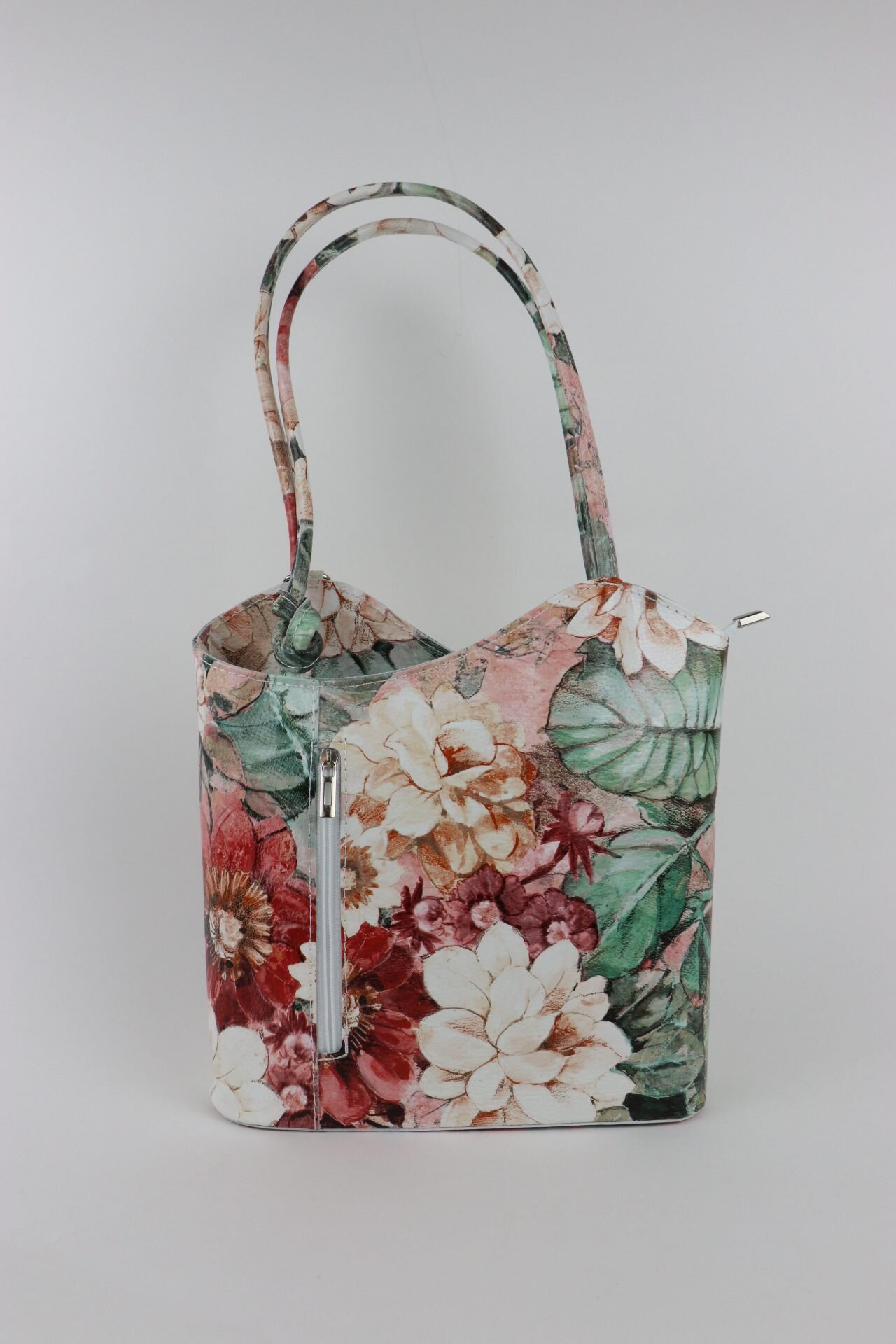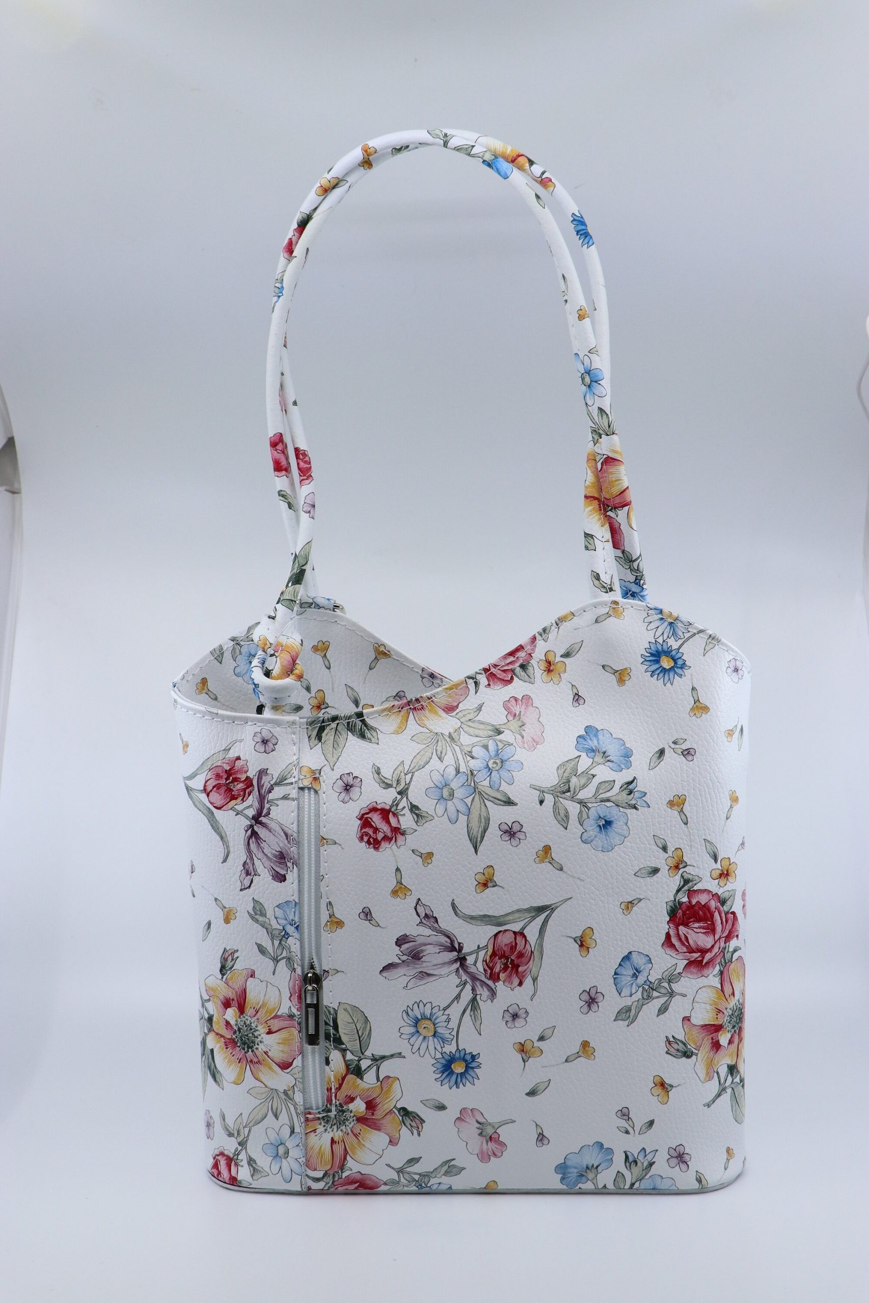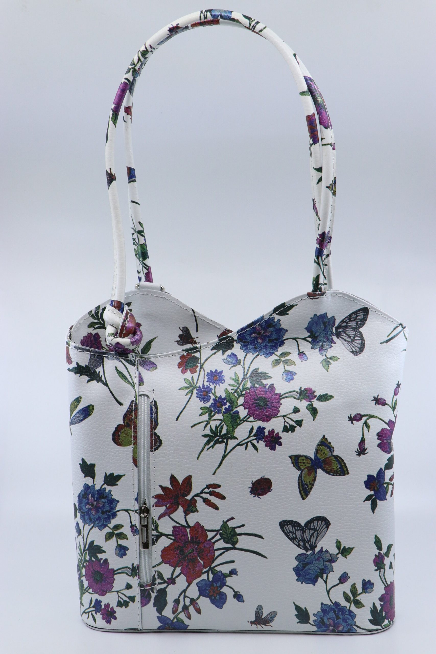 Embark on a style journey with our convertible bag, expertly crafted from genuine Italian leather adorned with enchanting floral and butterfly prints. This versatile accessory effortlessly transforms from an over-the-shoulder bag to a chic backpack, offering multiple styling options. The structured shape offers ample room, enhanced by convenient side zip pockets and two internal compartments to keep your belongings organized with ease.