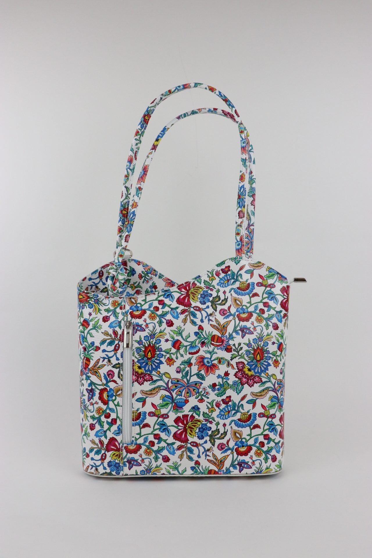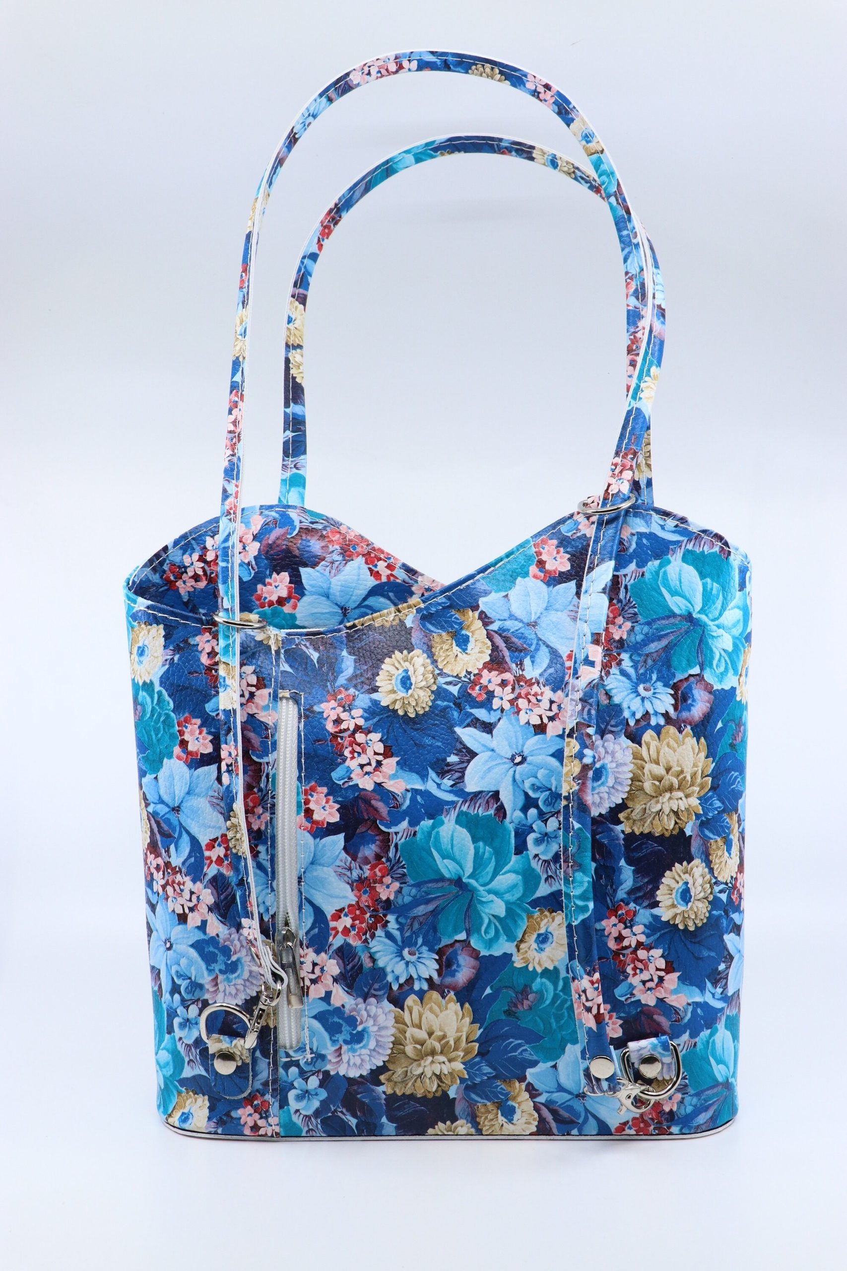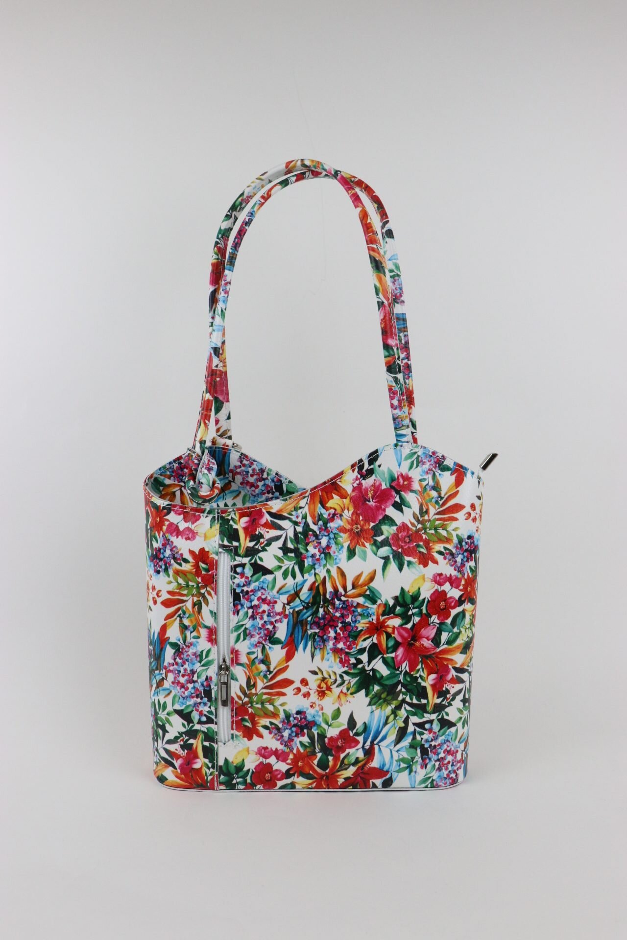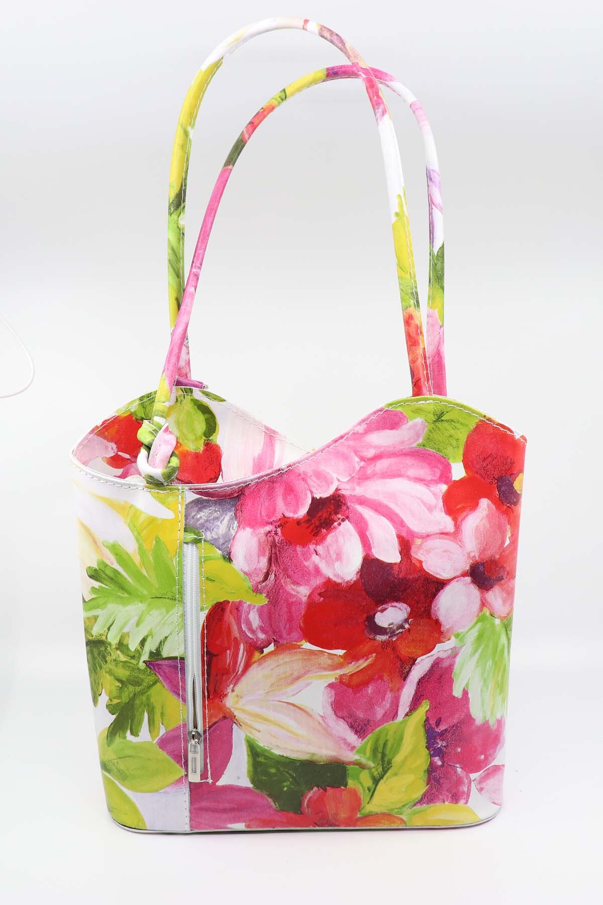 Embark on a style journey with our convertible bag, expertly crafted from genuine Italian leather adorned with enchanting floral and butterfly prints. This versatile accessory effortlessly transforms from an over-the-shoulder bag to a chic backpack, offering multiple styling options. The structured shape offers ample room, enhanced by convenient side zip pockets and two internal compartments to keep your belongings organized with ease.